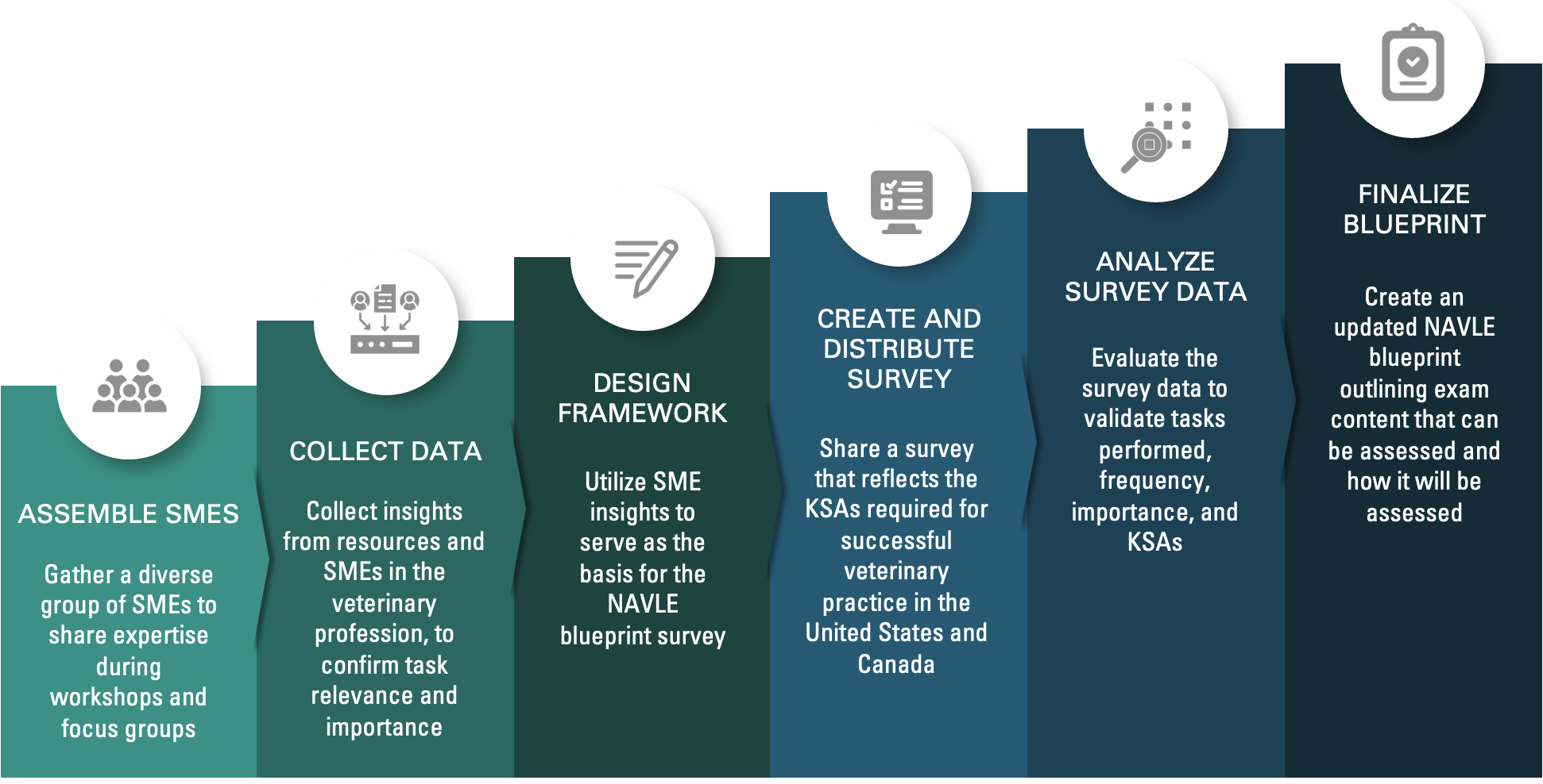 Data will be methodically collected from the Advisory Committee and the focus groups as an essential component of the NAVLE process to construct a survey that reflects the Knowledge, Skills, and Abilities (KSAs) required for the successful practice of veterinary medicine in the United States and Canada.
